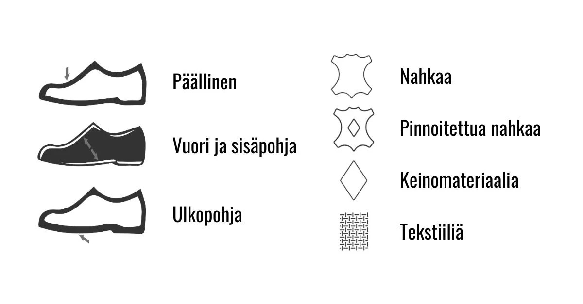 Materiaalimerkinnät löytyvät yleensä kengän sisäpuolelta; joko iltin alapuolelta (eli se lirpake, mikä jää nauhojen alle), tai vetoketjun takana olevasta tuulensuojasta. Joissain kengissä voi olla erillinen pesulappu, vähän kuin vaatteissa. Kuten erilaiset vaatemateriaalit, myös eri kenkämateriaalit vaativat erilaista pesua ja puhdistusta. Kun olet ensin tarkistanut, mistä materiaaleista kenkäsi on valmistettu, niiden puhdistus käy helposti.